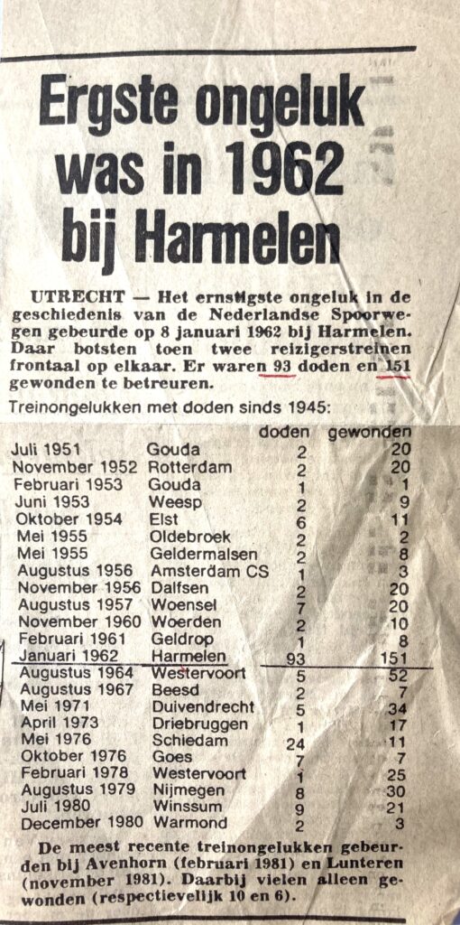 De volgende dag had ik moeite de trein te halen. Ik kon nog net in het middelste deel springen, de deuren gingen toen nog niet automatisch dicht. Meestal zat ik achterin. Nabij Harmelen begon de trein ineens over de bielzen te rijden. Ik was aan het lezen over een boeiend onderwerp, en de trein hing al helemaal schuin. Achter mij hoorde ik een vrouw en kind schreeuwen om hulp, dat ook tegelijk weer gesmoord werd. Vlak achter mij had een man het tegenovergelegen bagagerek tegen zijn borst gekregen en zat hierdoor helemaal vast. Tegelijkertijd viel er een lading glas over mij heen. En net twee minuten daarvoor kwam een man van het balkon in het zwart gekleed tegenover mij zitten, maar zei niets. Alleen mijn zitplaats was ongedeerd.
